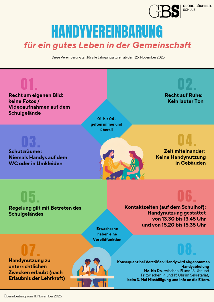 Fair, respektvoll und wertschätzend – das sind die Leitlinien unseres Change Codes, welche die gemeinsame Haltung an der Georg-Büchner-Schule prägen und Grundlage für unser schulisches Handeln darstellen. Eine positive und wertschätzende Lernatmosphäre ist eine wesentliche Grundlage für erfolgreiches Lernen aller Schüler_innen. Unabhängig von Leistungsstand, Kultur, Religion, Handicap oder Sprache erhält jeder Schüler und jede Schülerin die Möglichkeit, sich individuell bestmöglich zu entwickeln.